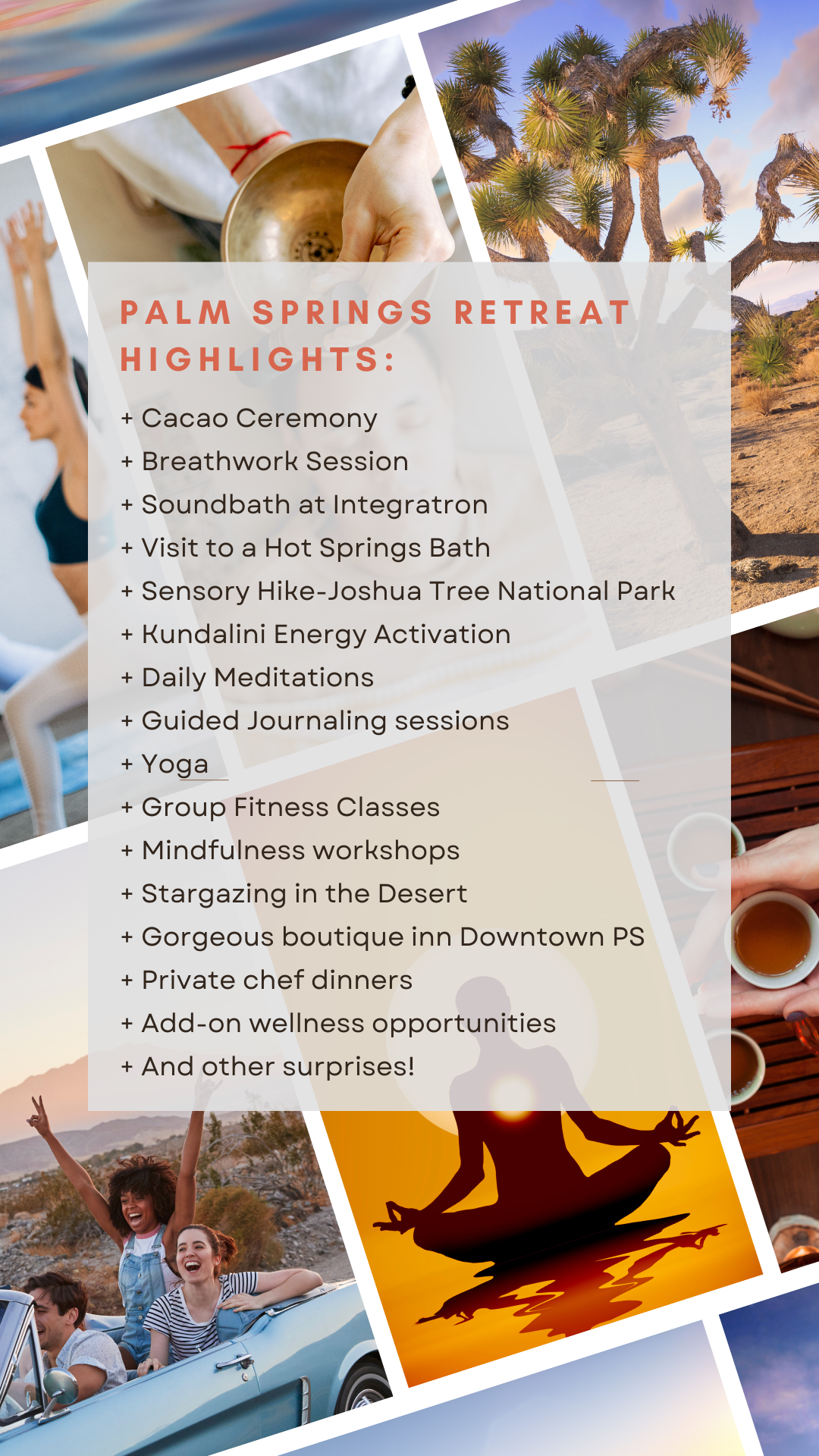Here is a sample list of the activities included in the all-inclusive pricing for this 4 day/3 night Rest & Renewal retreat in Palm Springs, CA on October 20-23, 2023. These activities are meant to provide moments of serenity while igniting the light within each of us. Ultimately, you will walk away from this retreat feeling nourished, transformed, and equipped with the tools to live a mindful lifestyle.